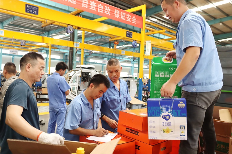 員工們分時段、分批次有序地進行領(lǐng)取。分發(fā)過程中,工作人員有對名單的、有派發(fā)的,還有收拾包裝盒的,忙忙碌碌的身影在人群中來來回回穿梭,溫暖而有愛。