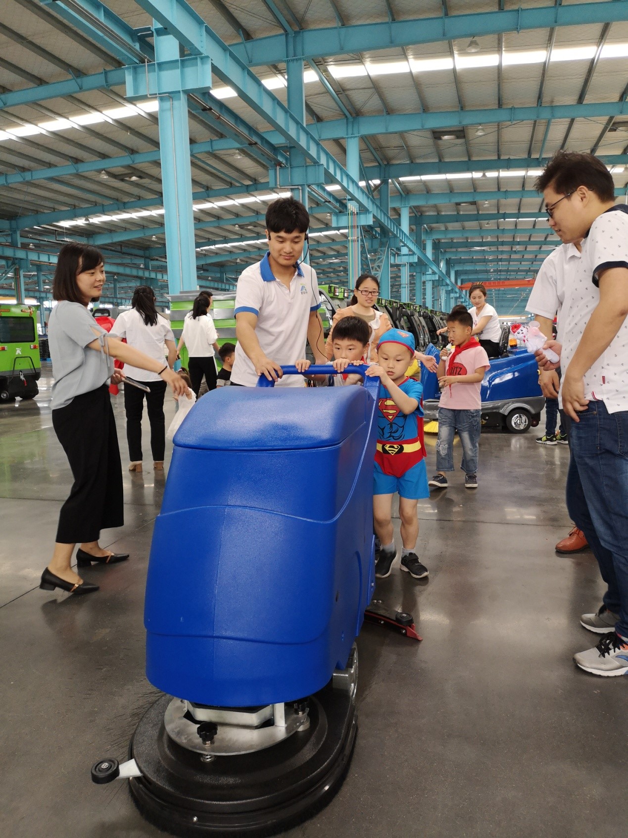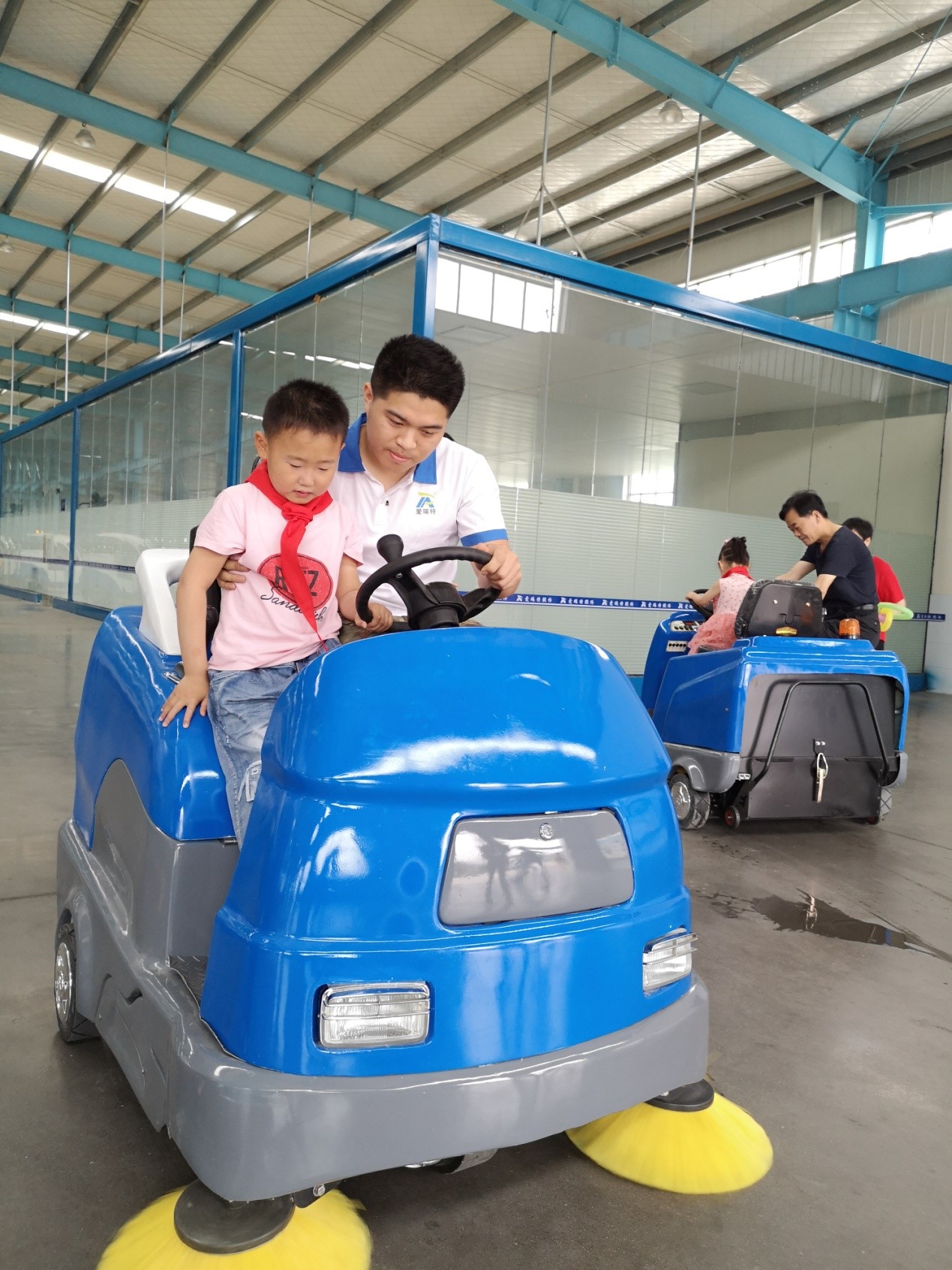 寶貝們開(kāi)著爸爸媽媽設(shè)計(jì)制造的掃地車(chē)、洗地機(jī),感到了無(wú)比的自豪和興奮,
