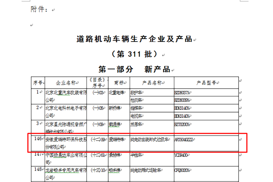 愛瑞特于2017年12月4日正式通過中華人民共和國工業(yè)和信息化部公布的道路機(jī)動(dòng)車輛生產(chǎn)企業(yè)及產(chǎn)品(第302批)公告,正式獲得汽車產(chǎn)品生產(chǎn)及銷售許可;2018年9月6日“愛瑞特”牌ART5040ZZZY50BEV型純電動(dòng)自裝卸式垃圾車正式列入工信部產(chǎn)品公告目錄(第311批)。
